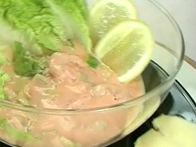 Рецепт закуски из креветок.Состав:креветки — 14 штук;лимон — 1 штука;соль, салат-латук, вустерширский соус, табаско, коньяк, сливки, кутчуп, майонез.