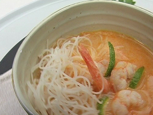 Необыкновенный суп из креветок с карри на рыбном бульоне с кокосовым молоком.Состав:креветки — 8 штук;рыбный бульон — 400 гр;кокосовое молоко — 200 гр;лемонграсс — 2 веточки;кориандр — 1 веточка;кунжутное масло — 50 гр;лаймовый сок — 50 гр.